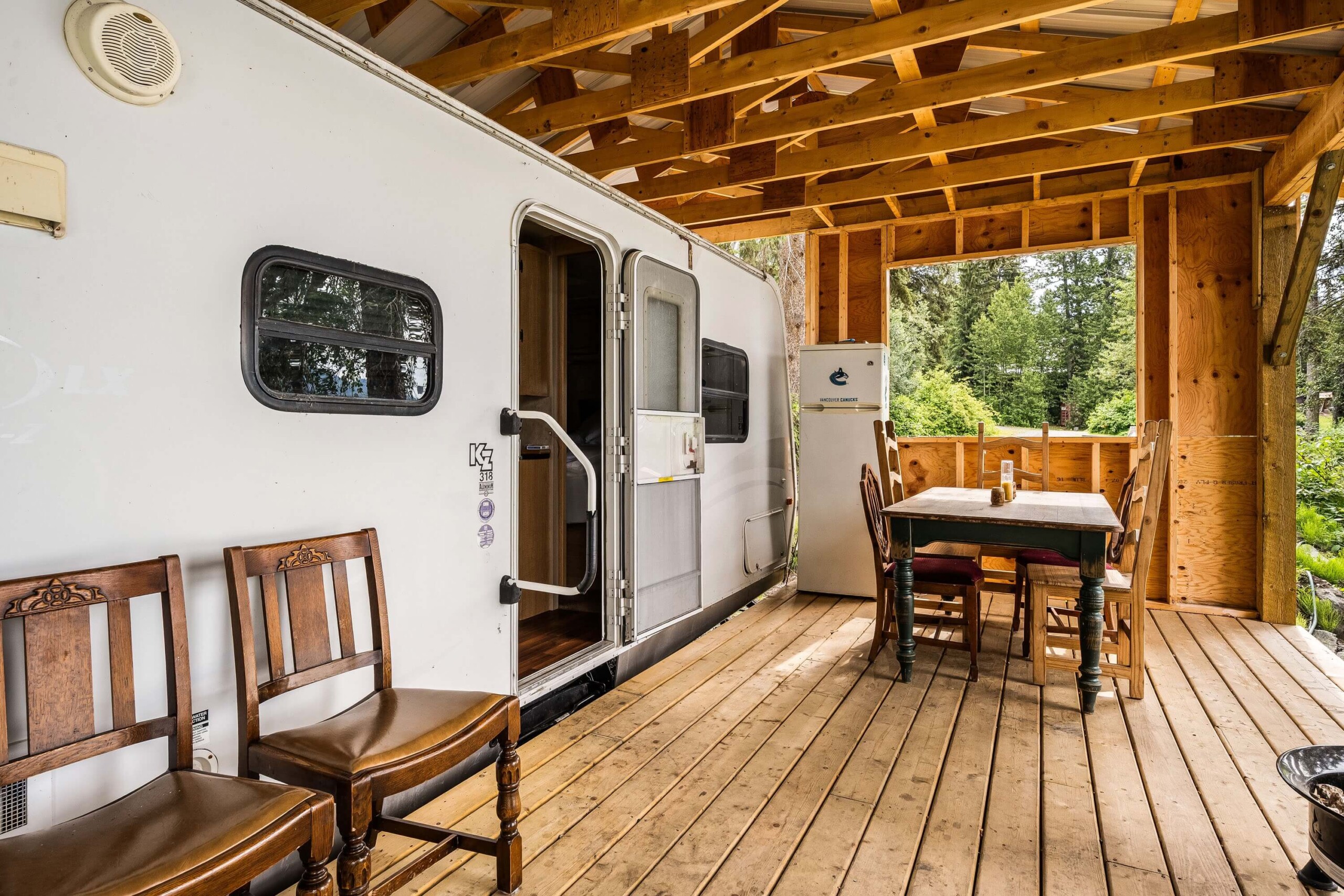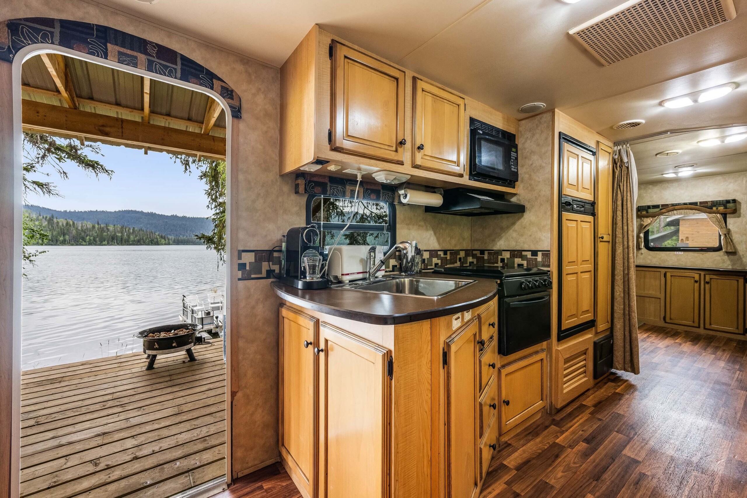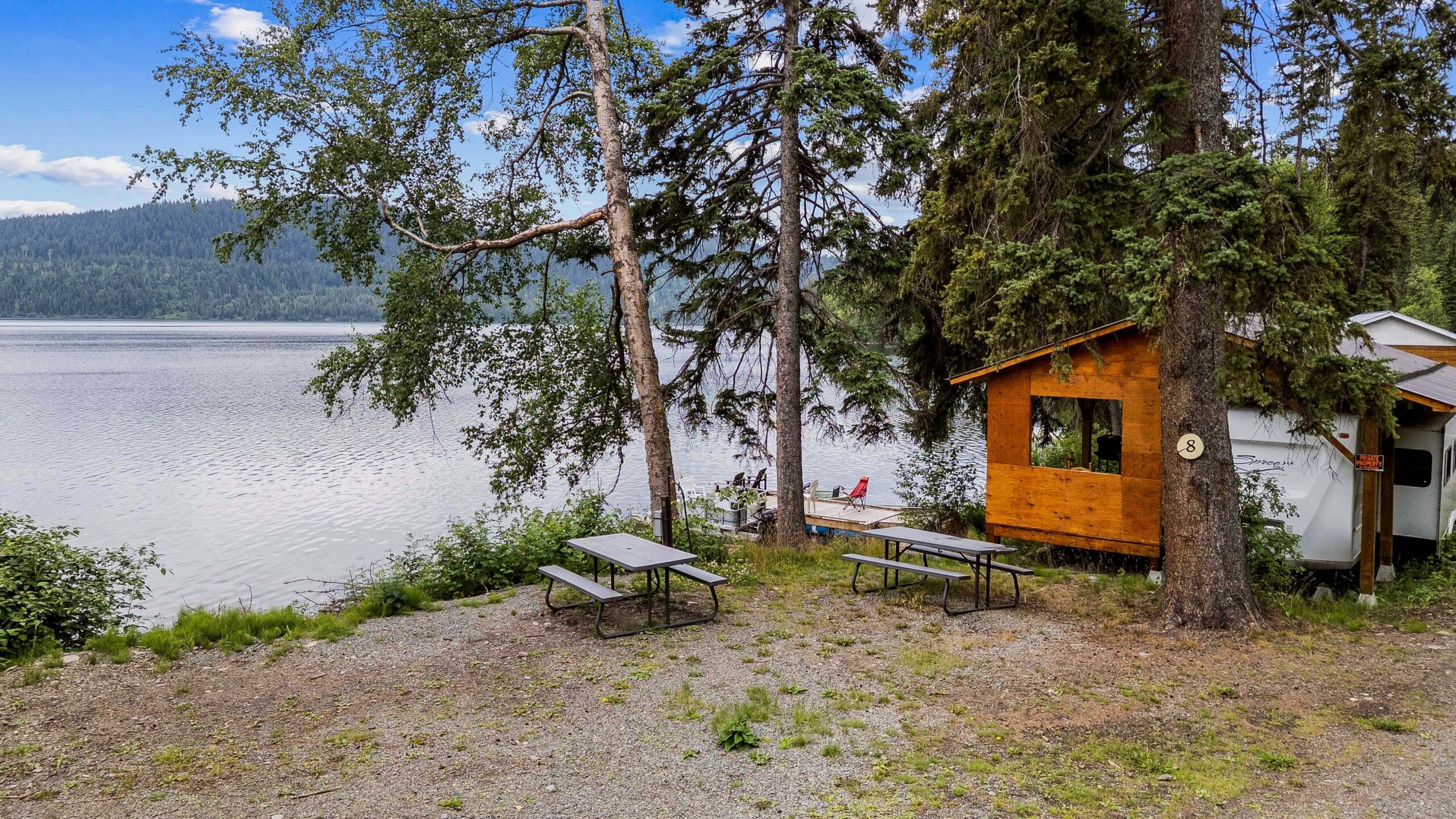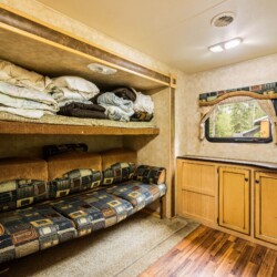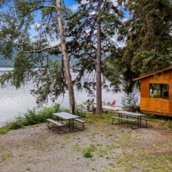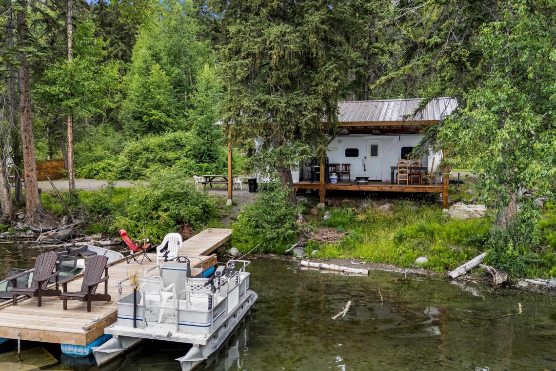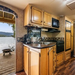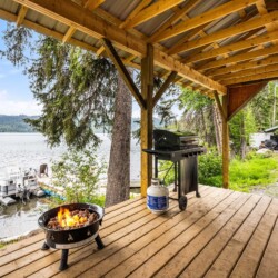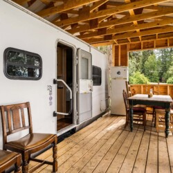 A rare find! Gorgeous RV snuggled up to the lake’s edge. Huge covered deck with barbeque, table & chairs. It has a queen in the master bedroom, bunk beds and a double pull-out bed. Boasts a large kitchen area with nook seating around the table. Two super slides create spacious comfort. Kayaks can be parked at the water’s edge just meters from your front door. Watch the kids fish from your deck and even stroll out and have yourself a much deserved refreshing dip. Bring your own bedding, pillow, & towels.