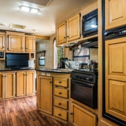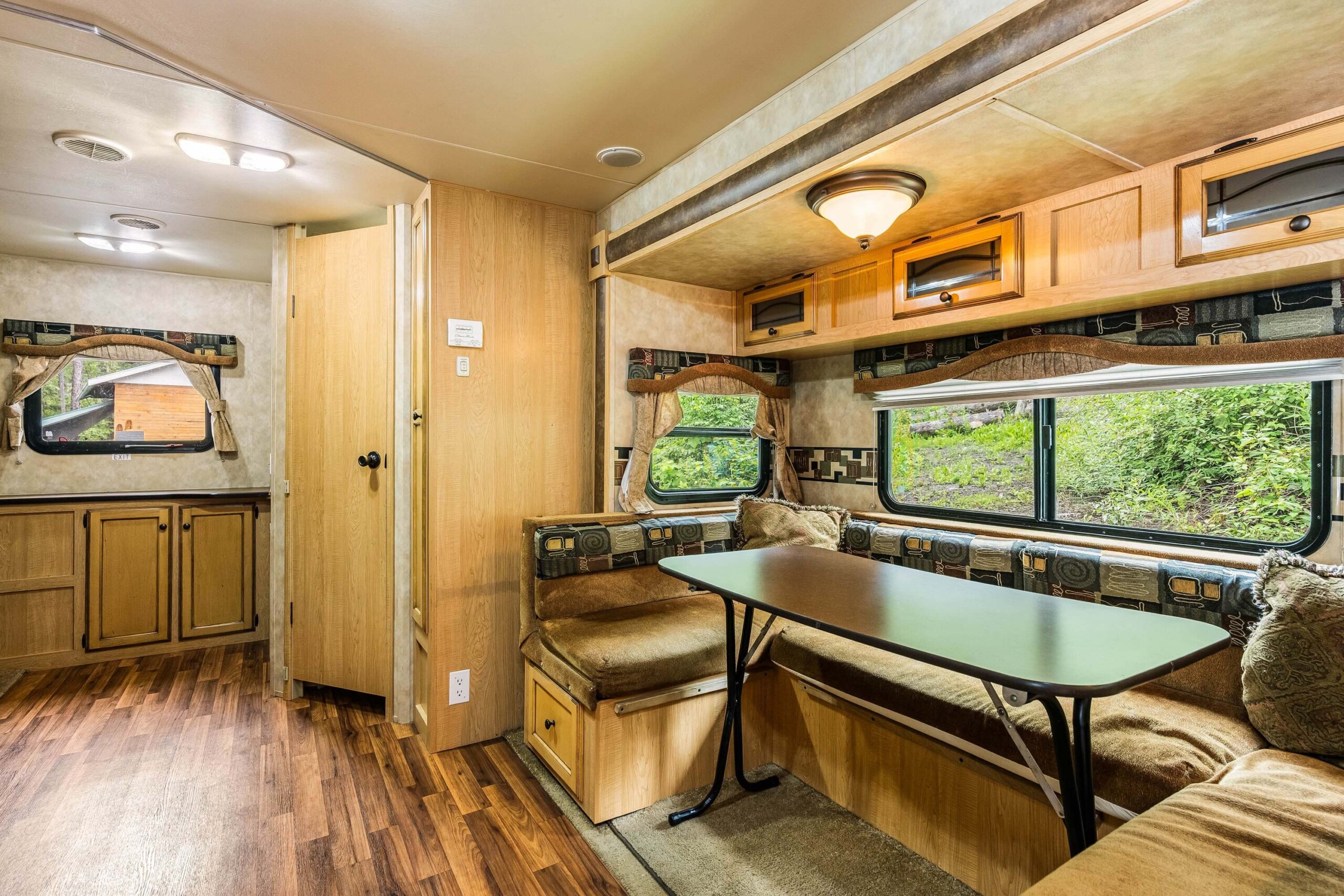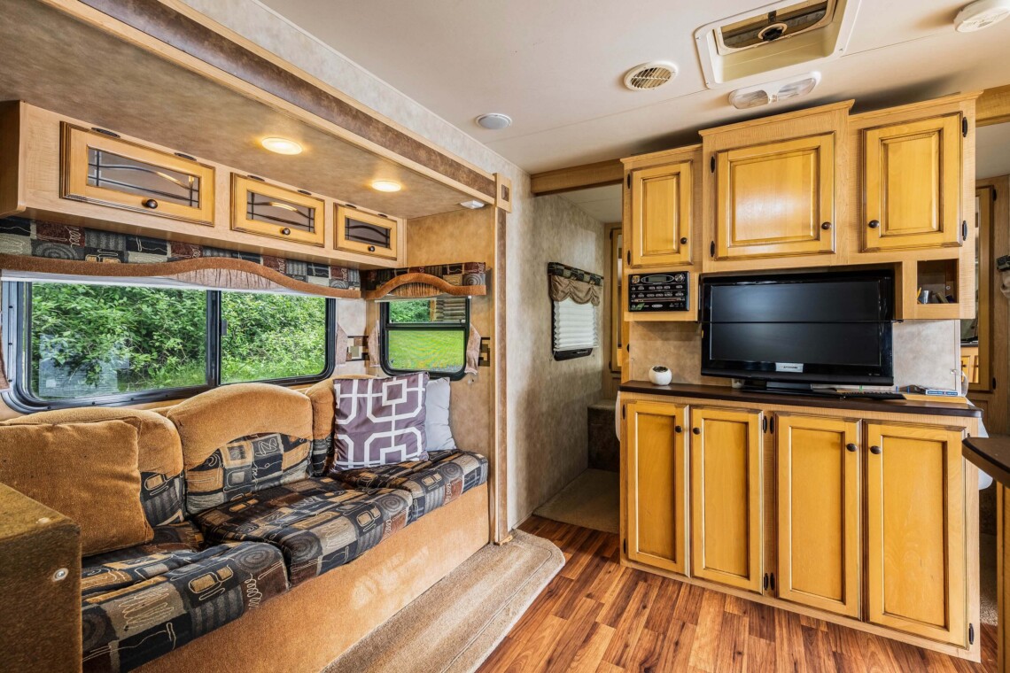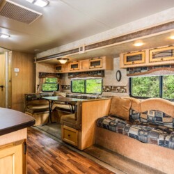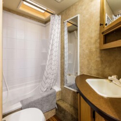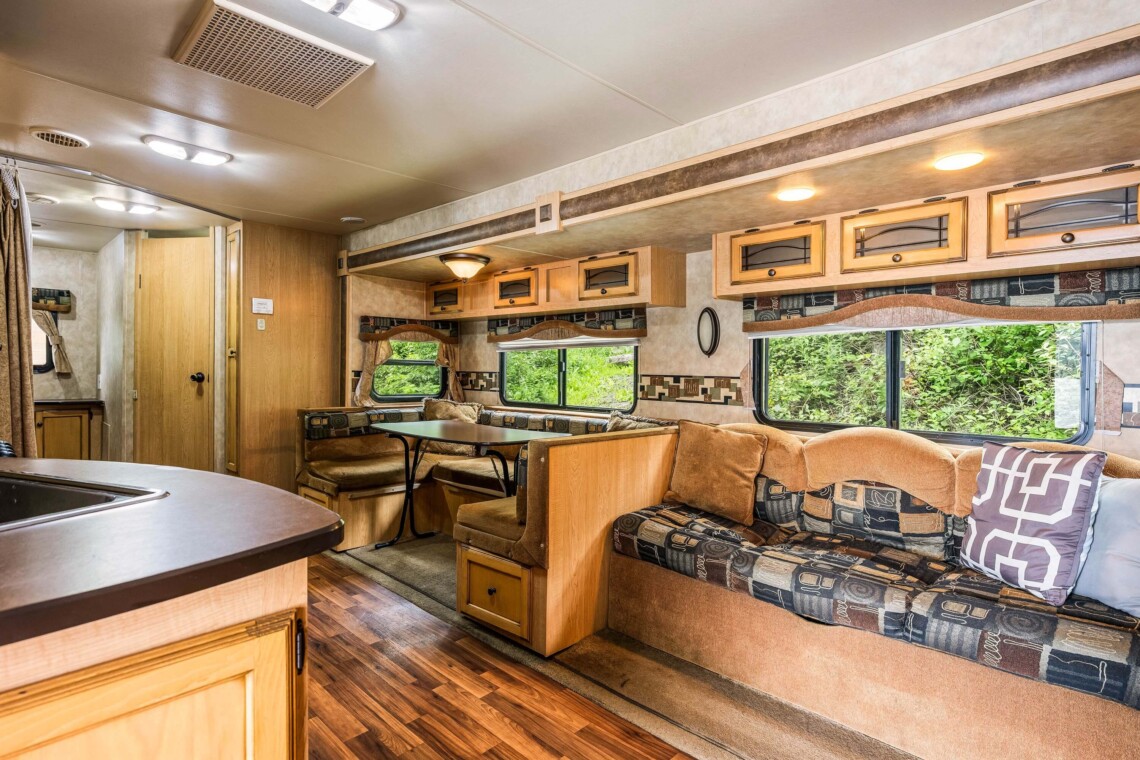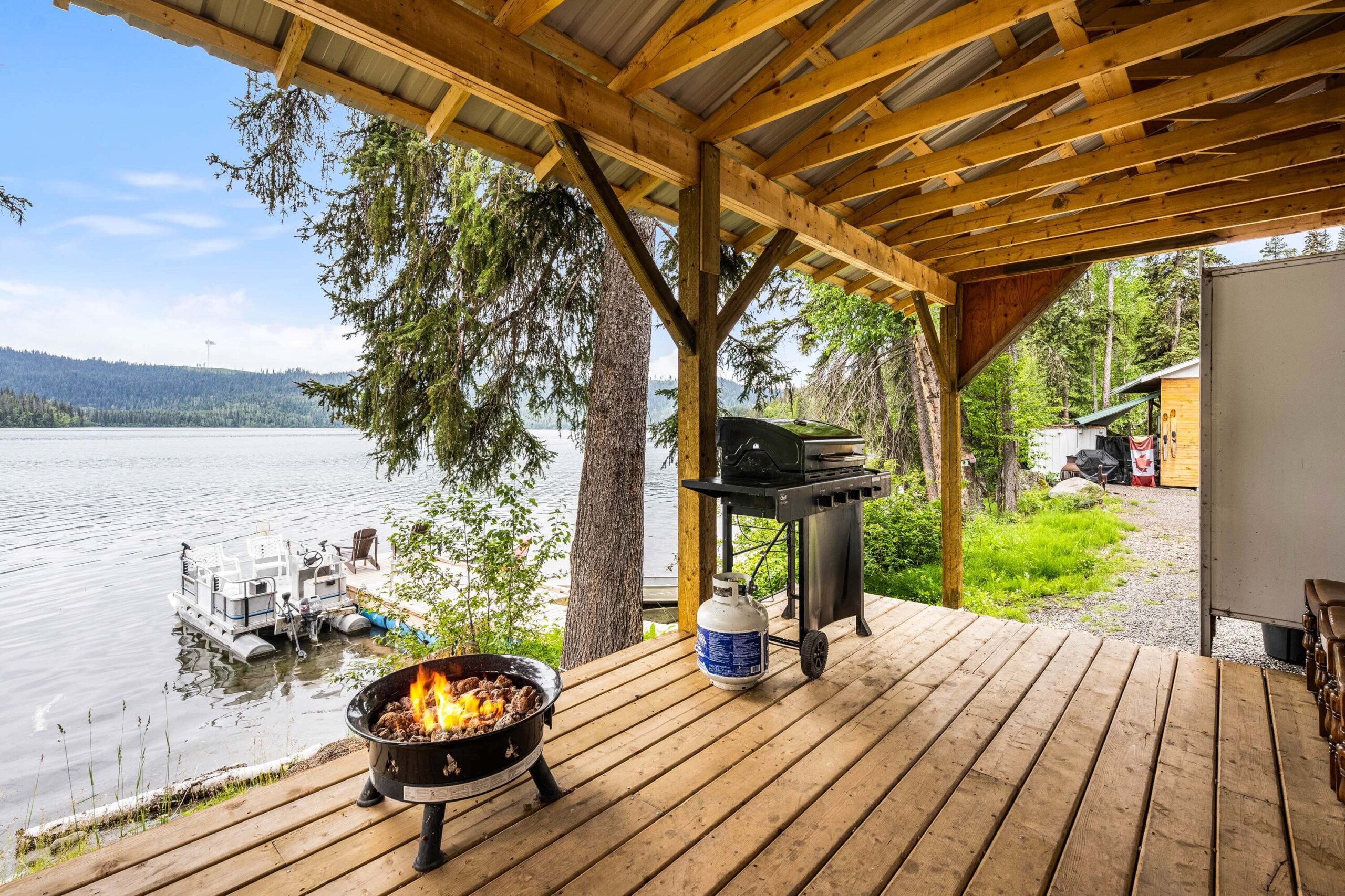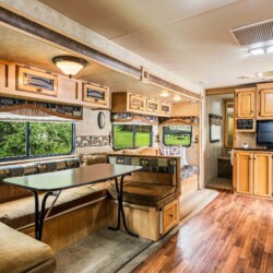 A rare find! Gorgeous RV snuggled up to the lake’s edge. Huge covered deck with barbeque, table & chairs. It has a queen in the master bedroom, bunk beds and a double pull-out bed. Boasts a large kitchen area with nook seating around the table. Two super slides create spacious comfort. Kayaks can be parked at the water’s edge just meters from your front door. Watch the kids fish from your deck and even stroll out and have yourself a much deserved refreshing dip. Bring your own bedding, pillow, & towels.